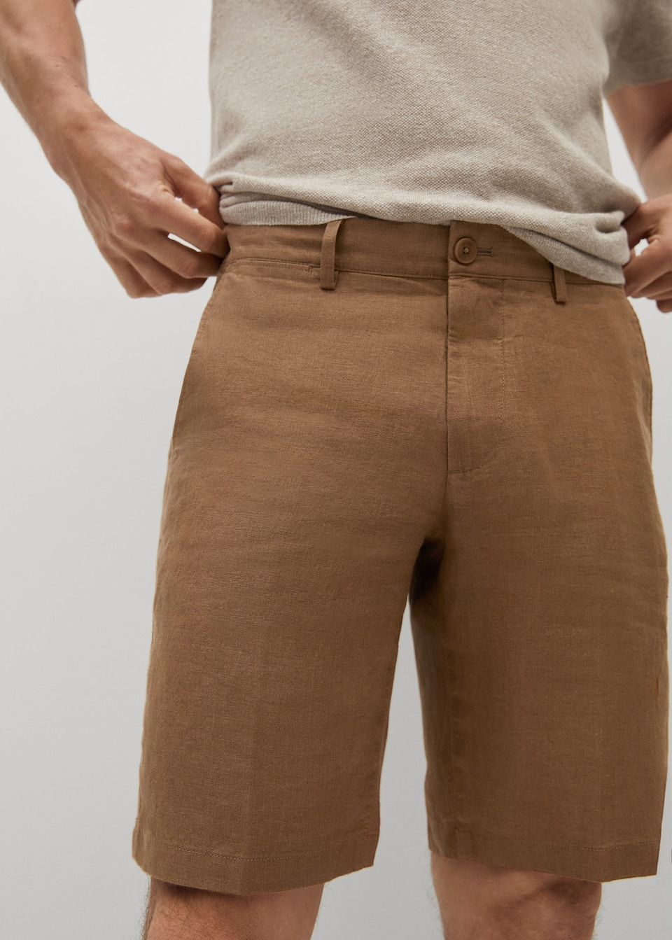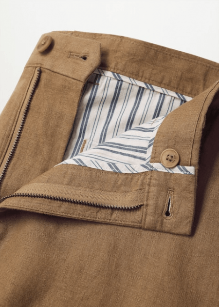 100 % lin. Passants pour la ceinture. Fermeture Éclair avec bouton. Deux poches latérales. Poche gousset. Deux poches passepoilées boutonnées à l’arrière. Le mannequin mesure 187 cm et porte une taille 40.