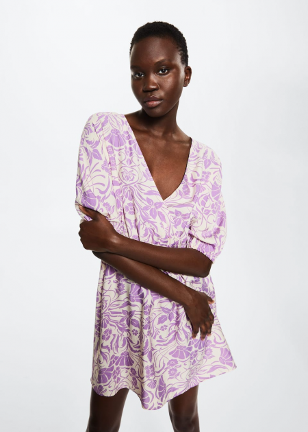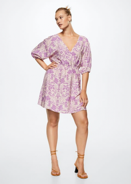Tissu fluide. Imprimé floral. Coupe courte. Évasé. Col croisé. Manches courtes bouffantes. Dos nu. Taille élastique. Fermeture à nœud à l’arrière. Disponible Plus.