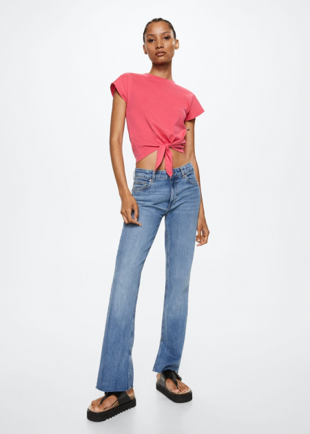 Tissu 100 % coton. Style crop. Droit. Col rond. Détail nœud. Manches courtes.T-shirt rose à nœud MangoTissu 100 % coton. Style crop. Droit. Col rond. Détail nœud. Manches courtes.