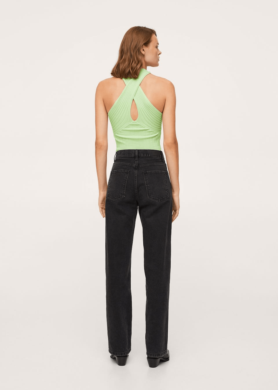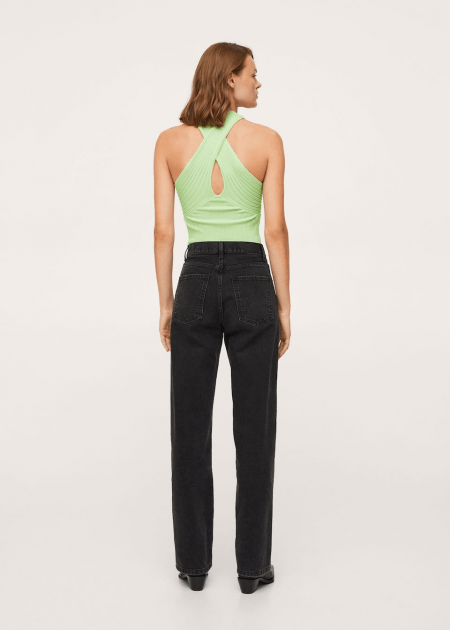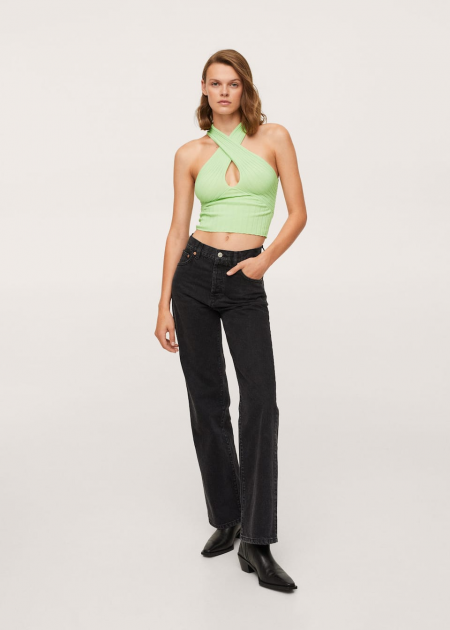 Tissu en maille côtelée. Style crop. Ajusté. Bretelles croisées. Bretelles larges. Sans manches. Cut-out.